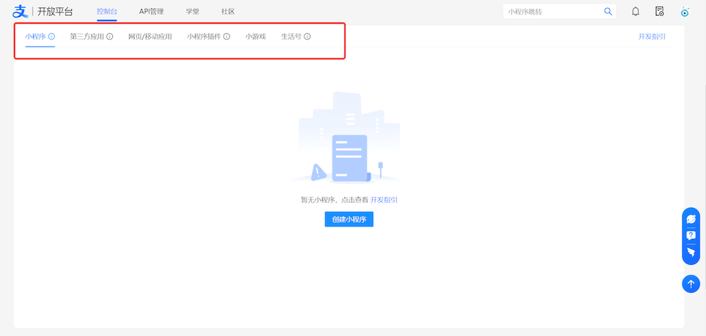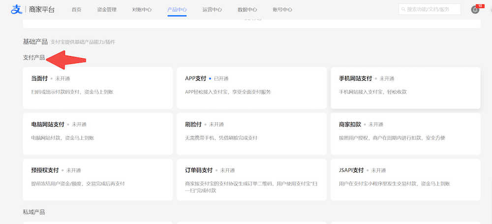 # 支付宝支付 ## 创建支付宝商户号 如果创建支付宝商户号,直接登入账号,如果为创建点击这里跳转创建 (支付宝商户号和支付宝开放平台是通用账号,商家号登入了开放平台直接登入)  ## 申请开通 APP 支付 1.在商家平台 产品中心=》支付产品  2.选择对应需要开通的支付功能,按提示填写相应的内容,点击申请开通,然后进入审核阶段 注意:需按照要求提交材料,若部分材料不合格,收款额度将受到限制(单笔收款 ≤ 2000 元,单日收款 ≤ 20000 元)。若签约时未能提供相关材料(如营业执照),请在合约生效后的 30 天内补全,否则会影响正常收款。 ## 支付宝开放平台 1.打开支付宝开放平台,进入控制台  2.创建需要接入支付宝支付的应用  3.按需填写应用资料,提交审核 支付宝审核还是蛮快,一般几个小时就会有结果